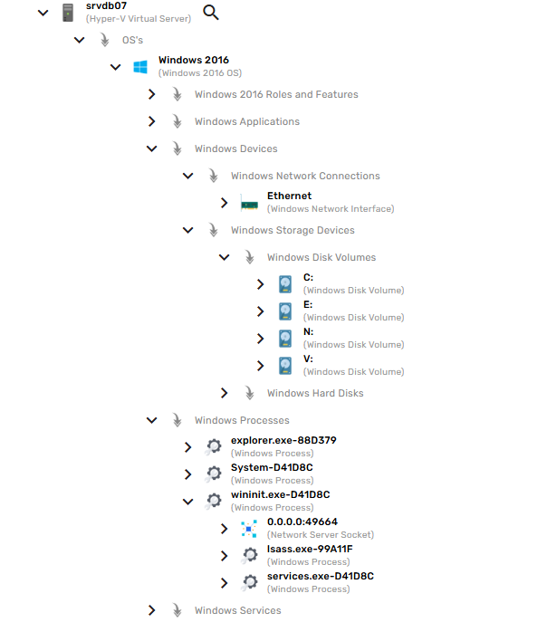 Na imagem acimaabaixo pode ser visto um servidorservidor. chamadoAo srvdb07,expandir, compostopodemos de discos C:, E:, N:, V:, de uma interface de rede chamada Ethernet e também de uma árvore de processos. Esse host representa a estrutura básica de relacionamento entre ICs no Priax. Cada IC em nível inferior na árvore compõever o seuSistema paiOperacional nodesse nívelservidor. imediatamente acima.