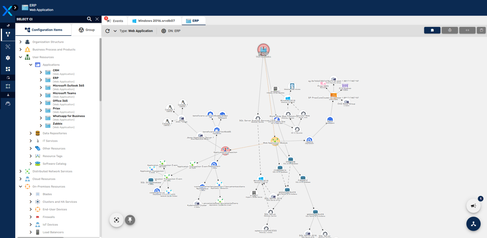 Na imagem acima, podemos ver as dependências de ima aplicação chamada ERP. Veja que a aplicação ERP está armazenada na árvore de ICszoom em User Resources\Applications\.