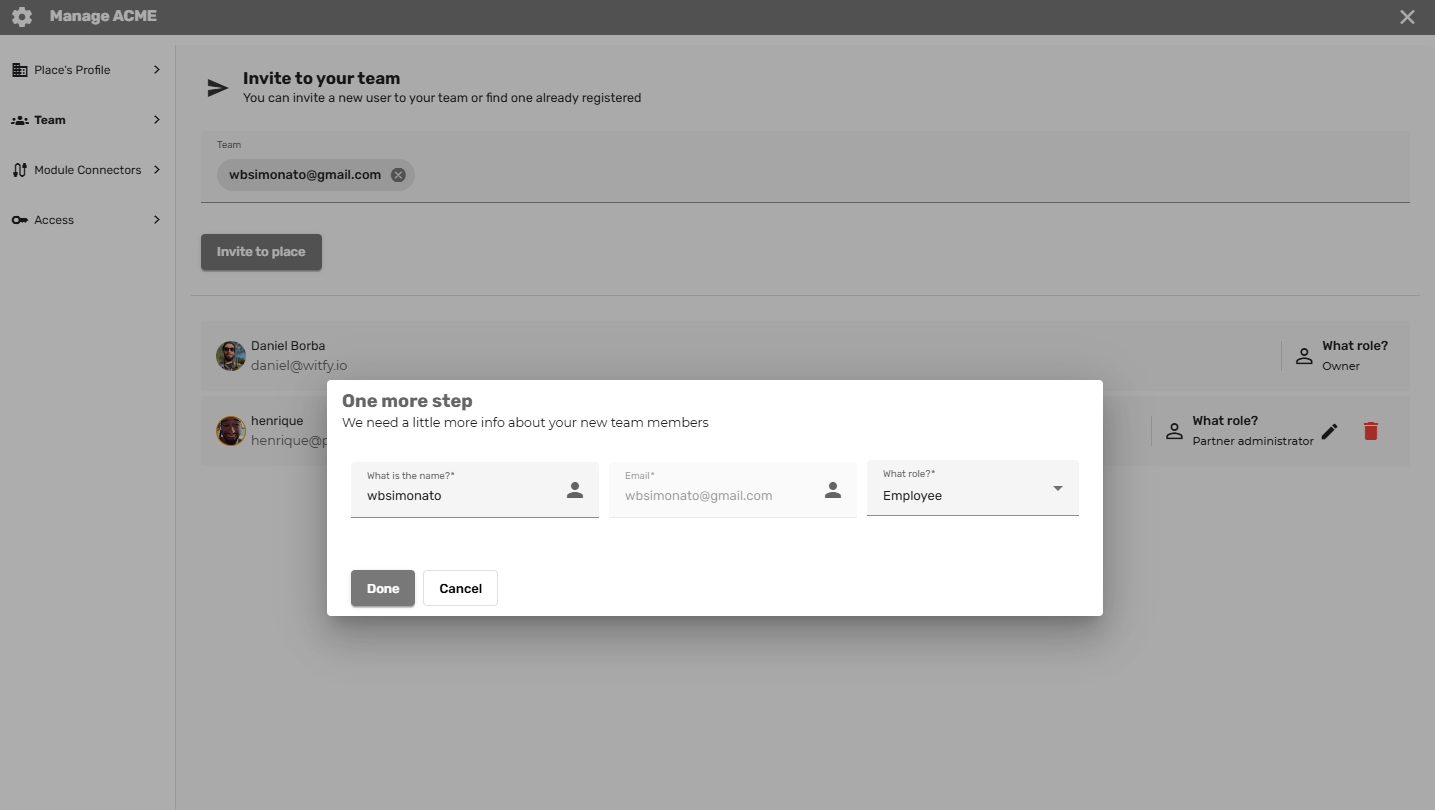 - Partner Administrator: Pode administrar todos os aspectos do local como o Nome, Logotipo, criar equipes, associar módulos., adicionar usuários e atribuir qualquer tipo de role..