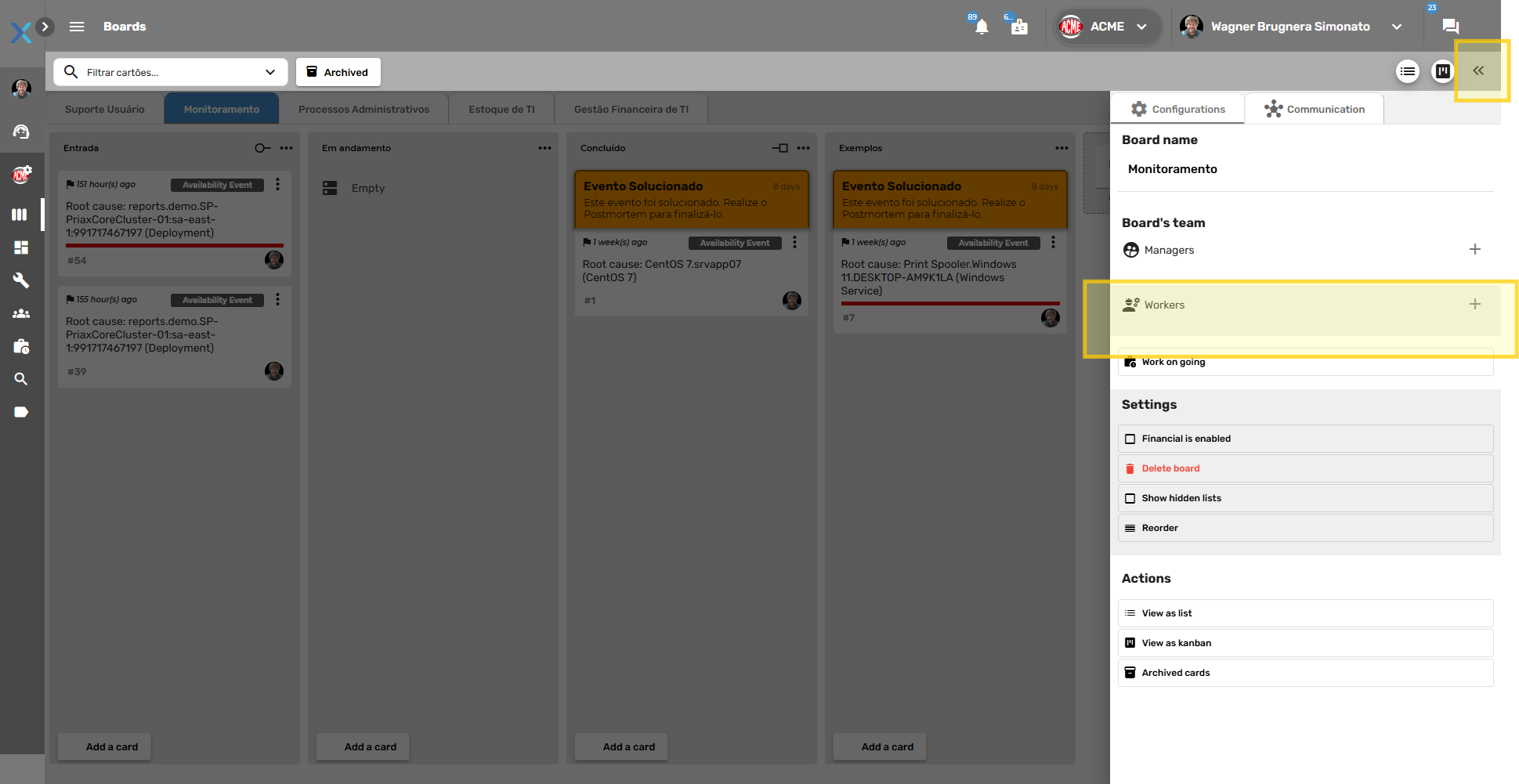 No sinal + você pode adicionar os usuários à equipe, como Manager ou como Worker do Board. Além de gerenciar os cards e demandas, os Managers podem reorganizar os quadros, mudar ordem das colunas, atribuir novos Usuários e gerenciar os responsáveis de todos os cartões do Board.