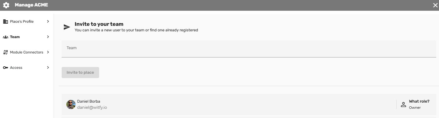 E finalmente para convidar um usuário, preencha o email do usuário e clique em "Invite to Place".